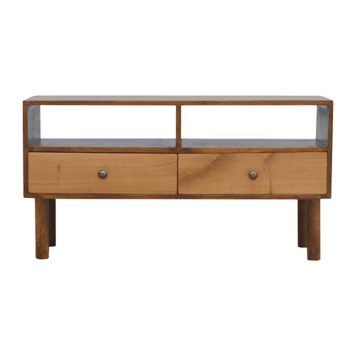 Immerse yourself in the exceptional beauty and practical design of the Oak Front Media Unit, a masterpiece that exudes a rich warmth and sophisticated contrast with its blend of two-tone wood elements. This media unit, thoughtfully crafted from 100% solid mango wood in a chestnut finish, presents a striking interplay with the natural oak wood drawers, culminating in a piece that is not only a haven for your multimedia but also a visual delight in your living space.