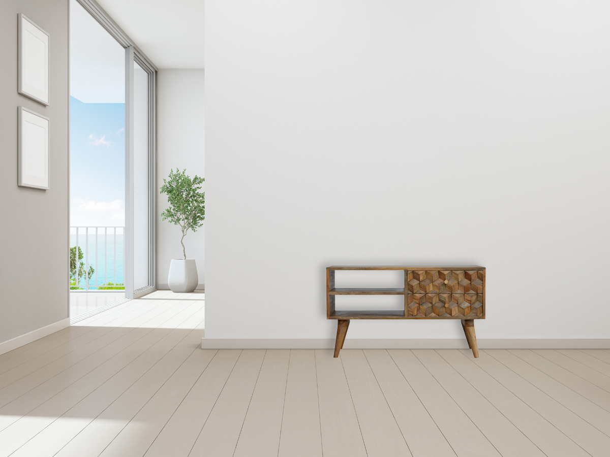 The main feature of this media unit is the carved cube doors fronts which make the pieces from this collection stand out. It has been constructed from 100% solid mango wood in an oak-ish finish, it features 2 open slots for extra storage and stands on 4 Nordic-style legs. It can be partnered with the other pieces from the range or stand individually as its style is versatile and can fit into different types of interiors.