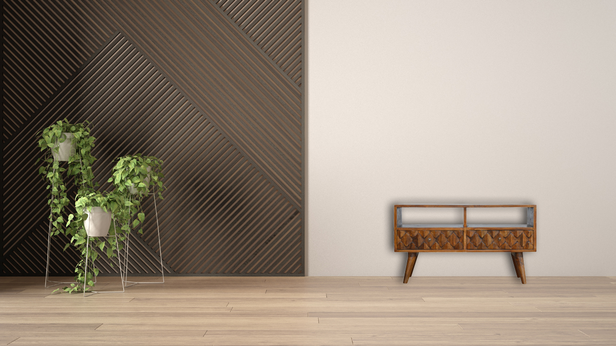 Embrace the principles of environmental mindfulness with this exquisite media unit, crafted from sustainably sourced solid mango wood. Mango wood is not only renowned for its durability and fine texture but also for its status as an eco-friendly choice, furthering the cause of responsible furniture making. The chestnut finish of the unit is the result of eco-conscious staining processes that minimize the ecological footprint. By selecting this piece, you align yourself with a community dedicated to the conscious preservation and appreciation of our planet’s resources while enjoying a product that does not compromise on quality or durability.