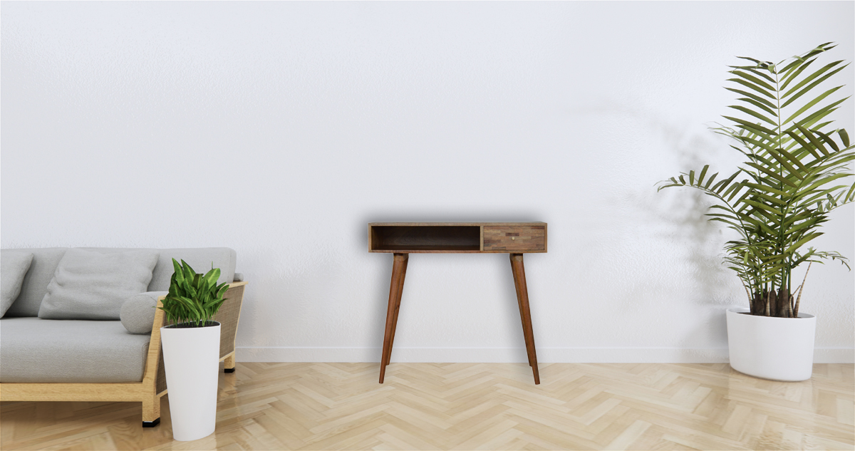 Constructed from the robust and treasured 100% solid mango wood, this writing desk is a paragon of durability. Adorned with an oak-ish finish coupled with a clear lacquer, the desk’s surface showcases resilience, ensuring it stands tall against the test of time and maintains its pristine condition throughout years of fervent use. Artists, writers, and professionals alike will find solace in this desk’s enduring quality and the powerful simplicity of its design.