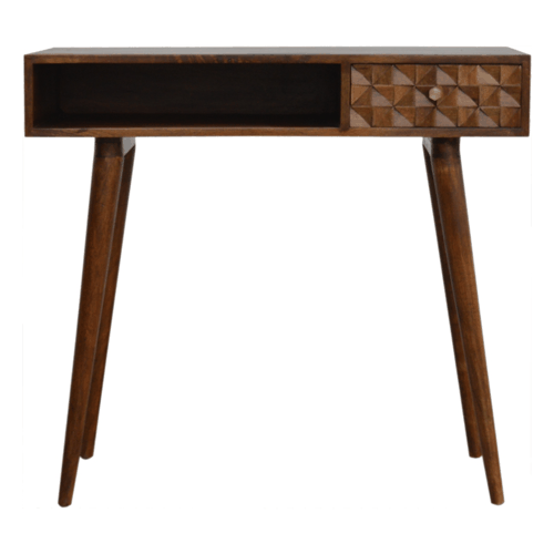 The main feature of this writing desk is the carved diamond drawer front which make the pieces from this collection stand out. It has been constructed from 100% solid mango wood in a chestnut finish, features 1 open slot for extra storage and stands on 4 Nordic style legs. It can be partnered with the other pieces from the range or stand individually as its style is versatile and can fit into different types of interiors.