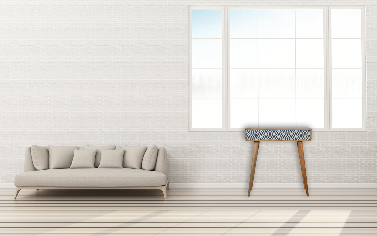 This beautiful and unique console table has been constructed from 100% solid mango wood in a fine oak-ish finish with a curved bottom design. The main feature of this piece is the monochrome screen printed drawer front which provides a lovely contrast between the print and the wood. Some other features include 4 Nordic style legs and 2 drawers any bits and pieces you wish to keep close by in the hallway.