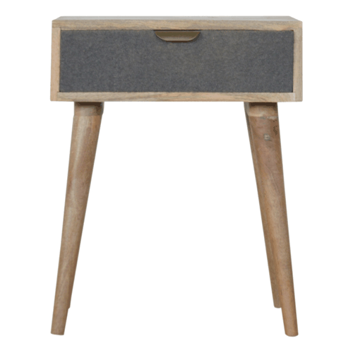 Elegantly designed for the contemporary home, the Grey Tweed Bedside Table serves as much more than a mere accompaniment to your bed. It stands out with its fabric front drawer, gracefully upholstered in a high-quality grey tweed, echoing the complementary design of its fabric front writing desk counterpart. This bedside table skillfully takes a distinctive twist on traditional furniture design, enhanced by the contrast of soft fabric and the enduring beauty of wood.