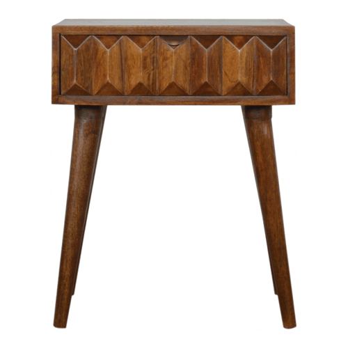 Enjoy the beauty of this bedside in your bedroom, constructed from 100% solid wood in a chestnut finish. It features 4 Nordic style legs and one deep drawer to take care of everyday utility items. The main feature is the hand carved raised pyramid drawer front which is bound to add a nice touch and lasting character to your home.