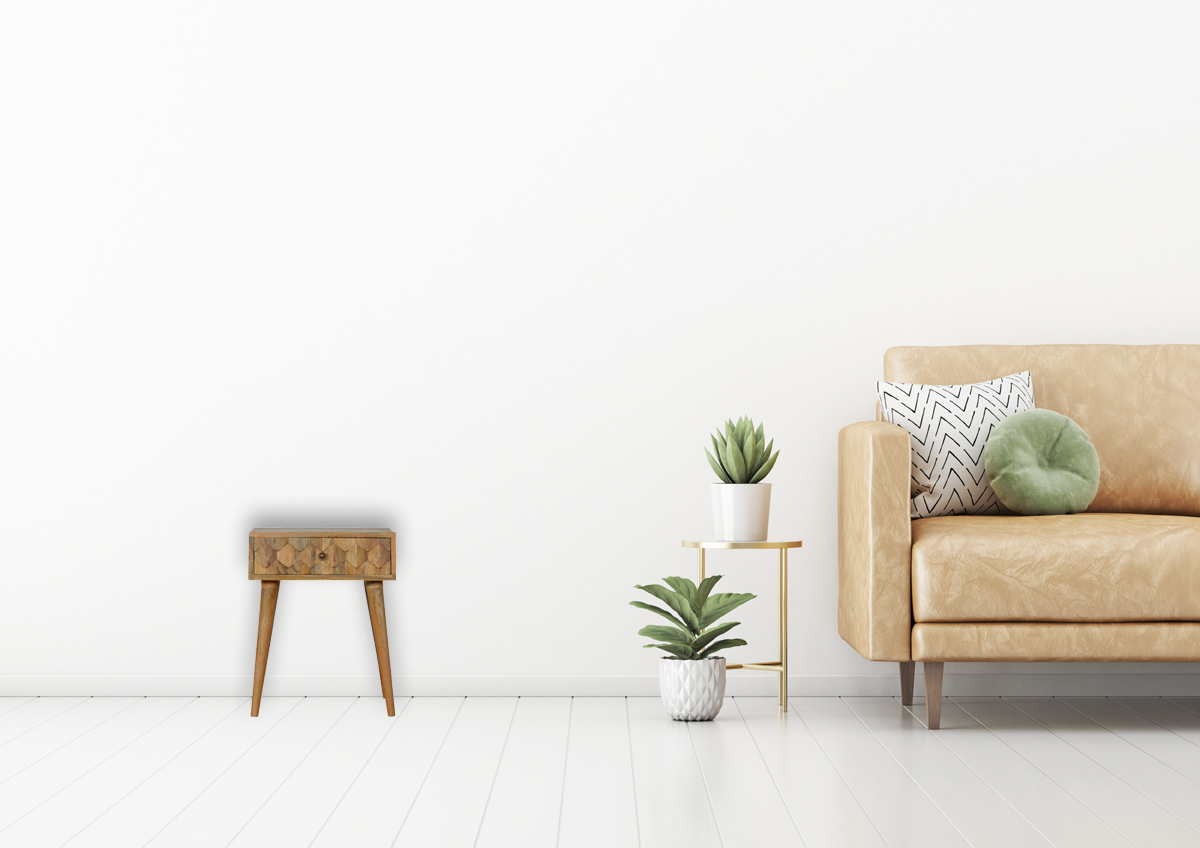 With its foundation cast in 100% solid mango wood, the bedside table emanates a warm oak-ish tone that readily invites a calming atmosphere into your bedroom. The surface, graced with a meticulously hand-carved pineapple design on the drawer, serves as both a visual and tactile delight, narrating tales of traditional craftsmanship intertwined with modern aesthetics. The compact silhouette is lovingly held aloft by four Nordic-style legs, facilitating a clean and airy profile that effortlessly complements contemporary spaces.