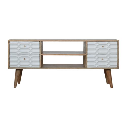 This beautiful media unit has been constructed from 100% solid mango wood in an oak-ish finish with unique white capsule style carved drawer fronts. It features 4 Nordic style legs, two deep drawers and 2 open slots to take care of everyday utility items.