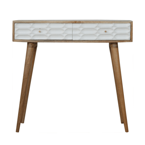 This beautiful console table has been constructed from 100% solid mango wood in an oak-ish finish with unique white capsule style hand carved drawer fronts that have been hand painted white. It features 4 Nordic style legs and two deep drawers to take care of everyday utility items. This console table will prove handy in your living room or hallway.