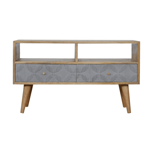 Envision your living room transforming into a hub of elegance and style with this media unit that exudes a sense of bespoke craftsmanship. The Geometric Carved Media Unit isn’t just furniture; it’s a statement that enhances your home decor with its distinctive carved drawer front and solid build, setting the stage for a well-curated entertainment area.