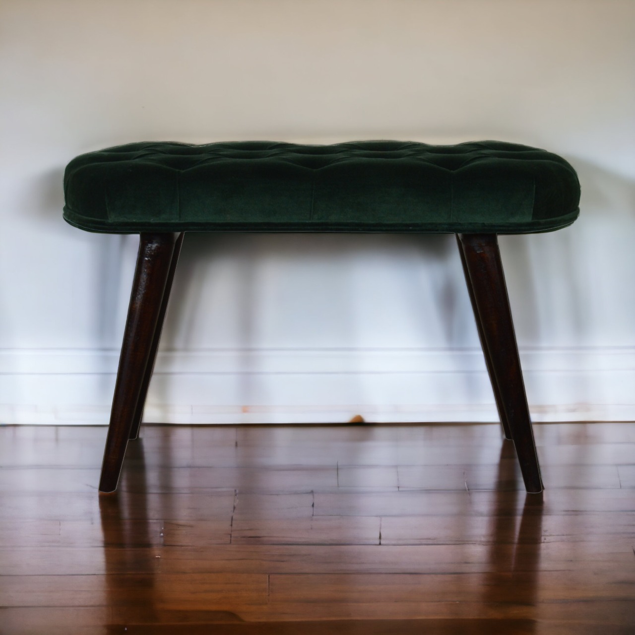 This Nordic style bench has been upholstered in a beautiful emerald cotton velvet fabric and features a classy deep-button design on the top. The bench stands on 4 legs constructed from 100% solid mango wood in a walnut finish and it is the perfect piece to add to your bedroom or hallway as a finishing touch in the home.