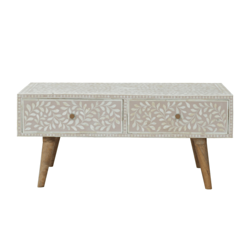 The beautiful coffee table has been constructed from 100% solid mango wood and features 2 spacious drawers decorated with a floral bone inlay which has been painted in a light taupe colour and finished with a oak-ish finish base and legs. It can be used as an accent piece in the home or be partnered with the other bone inlay pieces.