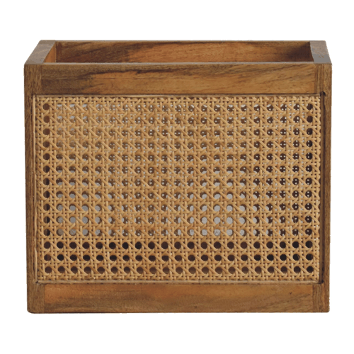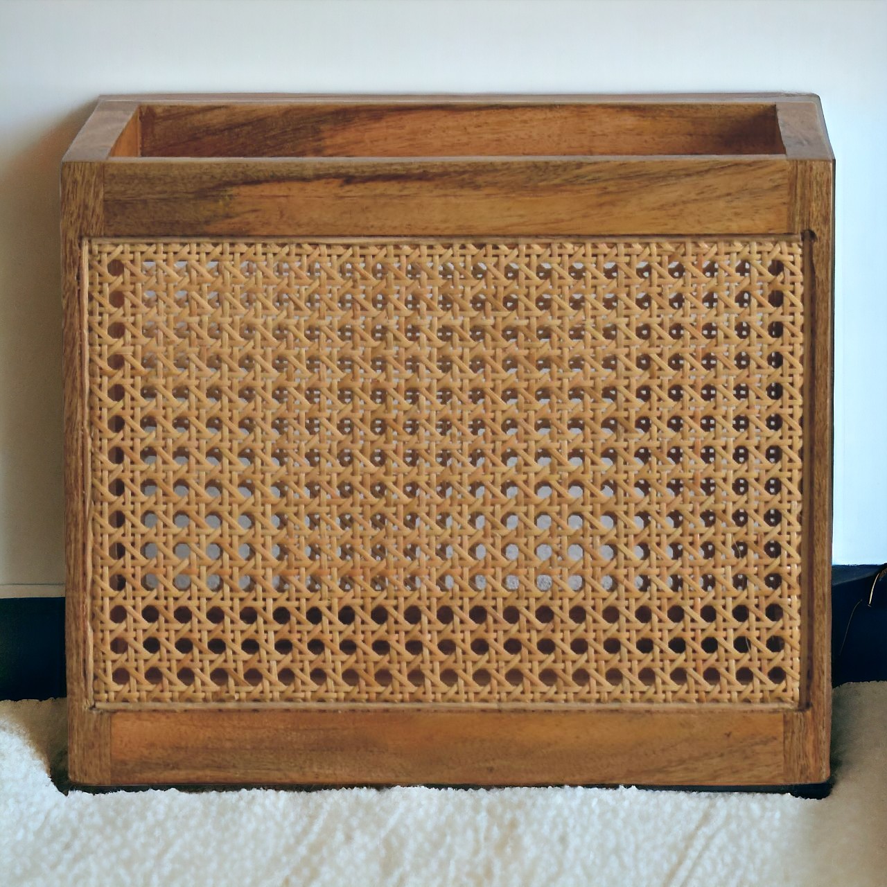 Infuse your living space with a touch of sophistication and the warm essence of nature with the Larissa Rattan Storage Basket, a chic storage solution that effortlessly balances aesthetics with functionality. Imagine a handwoven rattan front, embracing the bohemian spirit, seamlessly integrated with a solid mango wood body flaunting a smooth, oak-ish finish. This enchanting blend of materials and textures is not only pleasing to the eye but offers a practical haven for your everyday essentials—elevating organization to an art form.