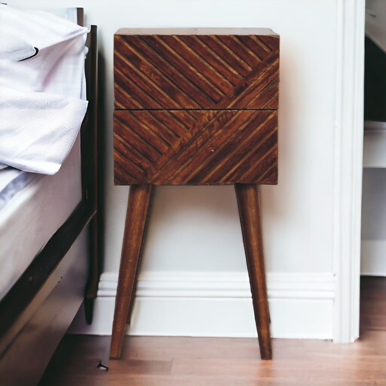 Add this mini unique solid wood Lille Bedside to your bedroom, constructed from 100% solid mango wood in a chestnut finish, this piece features a very unique line hand-carved design on the drawer fronts with a clean finish meaning easy access into the drawers without any knobs. It features 4 Nordic style legs which complement the body nicely and gives the entire piece a contemporary look. The perfect addition to the home. This petite product is a part of Recession Collection.