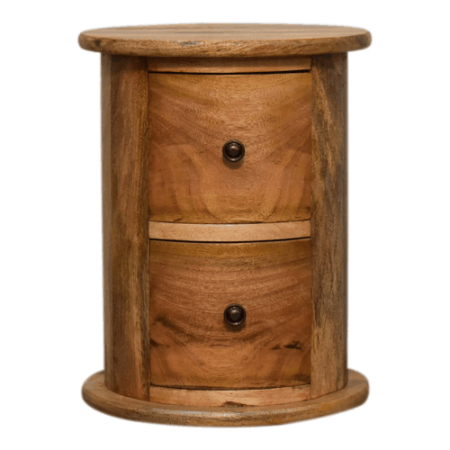 Discover the delightfully compact Mini 2-Drawer Drum Chest, an exquisite piece that infuses the quaint charm of country style into a practical storage solution. Perfect for homes that celebrate both elegance and organization, this adorable round chest is carefully crafted from 100% solid mango wood. With its fine oak-ish finish, gleaming knobs, and space-efficient design, it not only stores your cherished small items like keys and loose change but also offers an inviting surface to exhibit photos, ornaments, and collectibles.