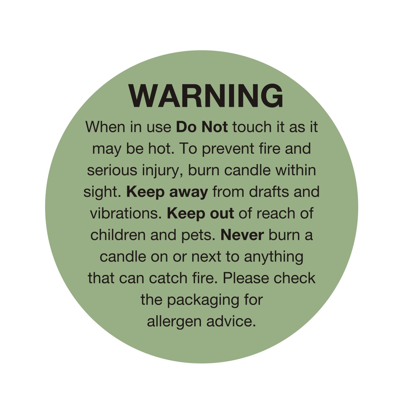 WARNING – When in use Do Not touch it as the surface may be hot.To prevent fire and serious injury, burn candle within sight.Keep out of reach of children and pets.Never burn a candle on or next to anything that can catch fire.