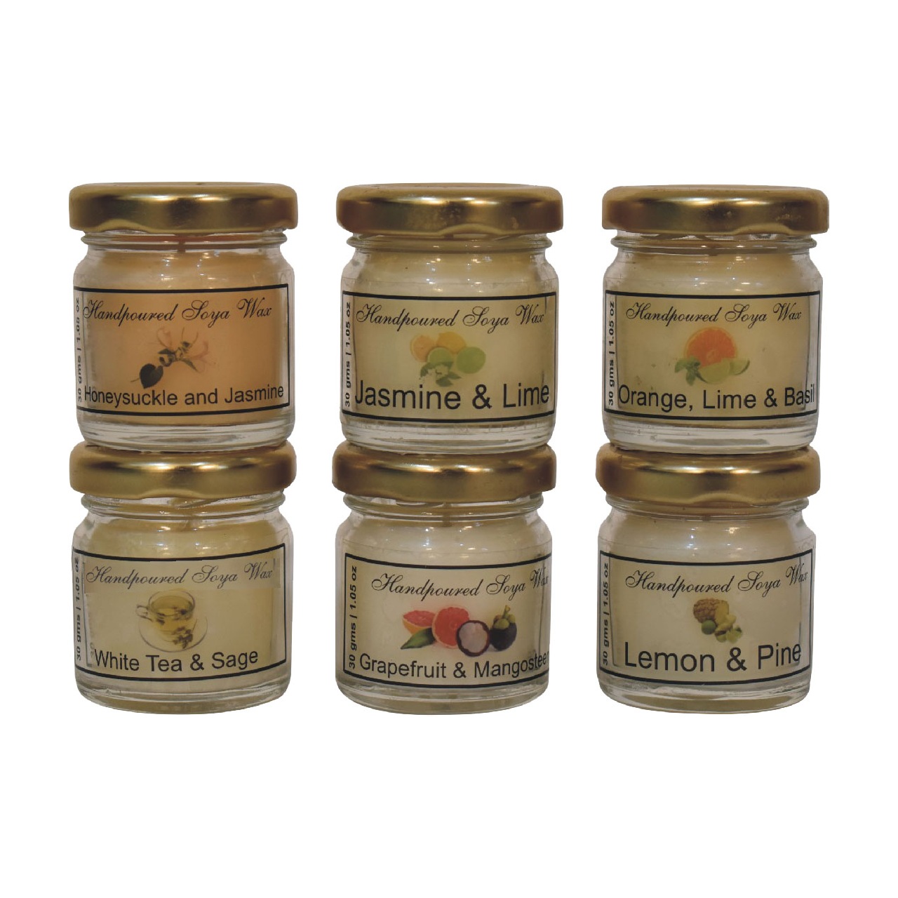 Set the mood with our mini candles, made to be used in any room of the home, especially suited for the living room, bedroom or bathroom. This cute set of 6 comes with a wonderful selection of Honeysuckle & Jasmine, Jasmine & Lime, Orange, Lime & Basil, White Tea & Sage, Grapefruit & Mangosteen and Lemon & Pine scented candles. Light and enjoy.
