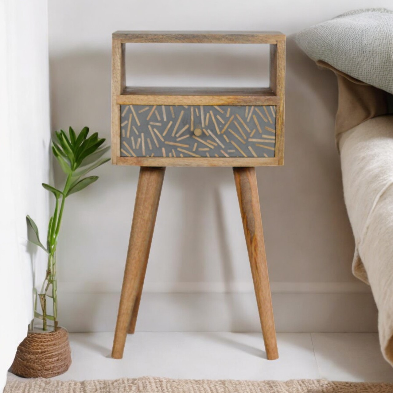 The Mini Cement Chip Drawer Bedside is meticulously constructed from 100% solid mango wood with a natural oak-ish finish that radiates warmth and coziness. Its compact size belies its capable storage options, offering a drawer for private items, a shelf for books or decorative elements, and an ample tabletop to showcase a lamp, a succulent, or your favorite nighttime reads.