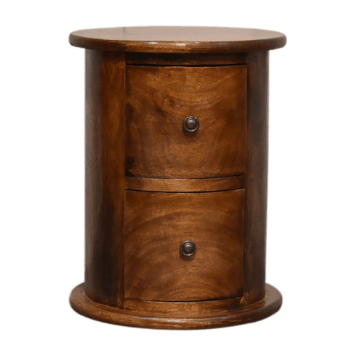 This cute mini round 2-drawer country-style drum chest is made from 100% solid mango wood and has a fine chestnut finish with shiny knobs on the drawers. The piece is perfect for storing small items like keys, and loose change and has space on top for displaying photos, ornaments, and collectibles. This product can be used as either a bedside table, an end table, or an occasional table. This petite product is a part of Recession Collection.