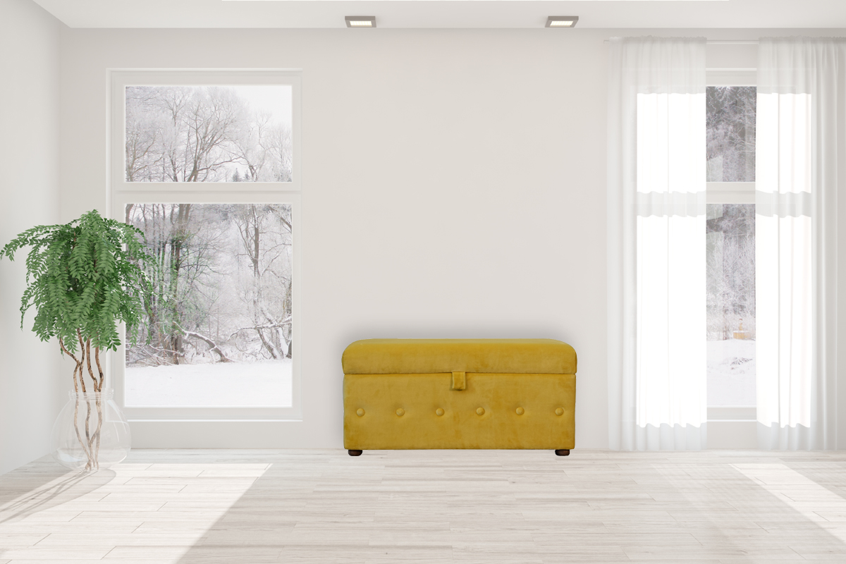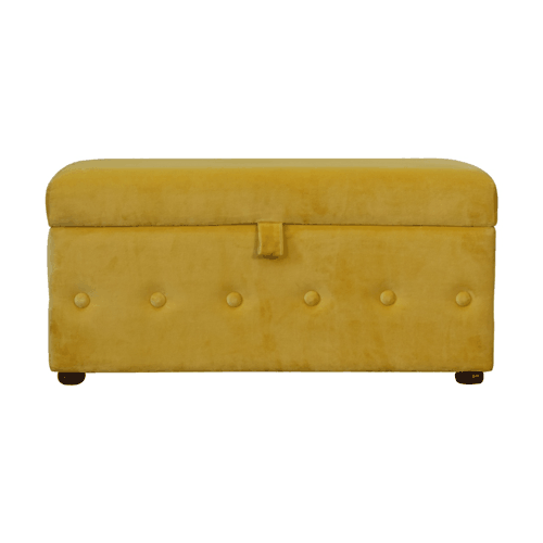 Make home storage effortlessly easy and elegant with this ottoman. Upholstered in a beautiful mustard cotton velvet fabric. There is lots of room inside for plenty of storage as well as a deep button design giving it a chic look. It is finished with four solid wood feet for balance. A discreet way to keep your home clean and tidy.