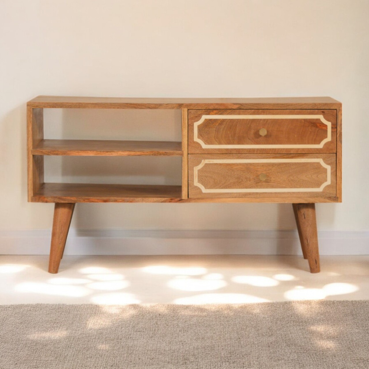 The highlight of this media unit is its duality in design—featuring two open slots and two bone inlay drawers. The open slots are perfect for housing media devices like DVD players, game consoles, or streaming devices. The open design ensures optimal ventilation for your electronics, preventing overheating and ensuring they remain in excellent working condition.