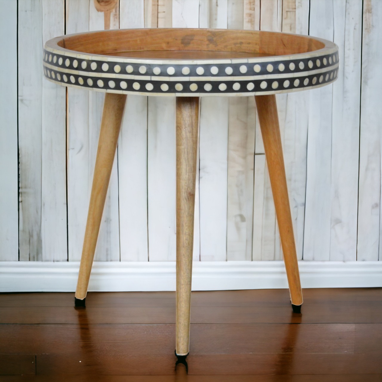 Introducing the Large Dotted End Table, an exquisite statement piece designed to bring both functionality and timeless elegance to your home. This meticulously crafted table combines the grace of Nordic design with the naturally striking beauty of mango wood. Featuring a unique black and white bone inlay pattern around the edges, this table is bound to capture attention and admiration in any setting. Ideal for contemporary, minimalist, or eclectic interiors, this end table epitomizes the seamless blend of traditional craftsmanship and modern aesthetics.
