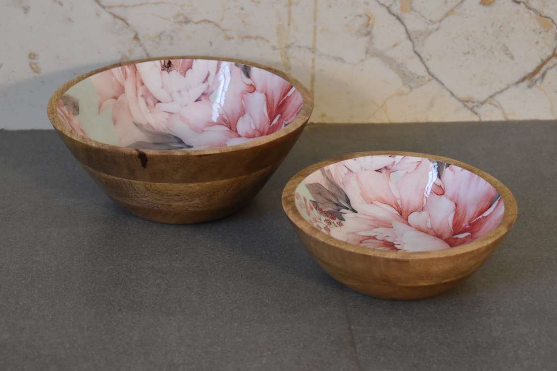 Beautifully crafted from solid Mango Wood, this beautiful bowl set is bound to wow your guests. With natural Mango Wood grain detailing externally and internal lacquered pink rose patternings, the style and contrast of the design and wood finish really allow the natural beauty of materials to shine.This product is handcrafted individually and as every piece is unique please do expect variations in finish, texture, size and should not be considered as a defect.