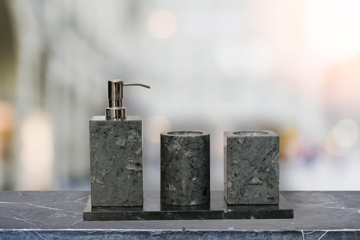 This 5-piece bathroom set is made of round polished Green Marble. Consists of a square soap dish, toothbrush cup, a soap dispenser with metallic dispenser head and cosmetic box with lid. A beautiful set of accessories for your bath as well as making a unique gift choice.Expect differences in texture, color, grains etc., as this product is extracted from a natural source. This is a natural configuration and should not be considered as a defect.