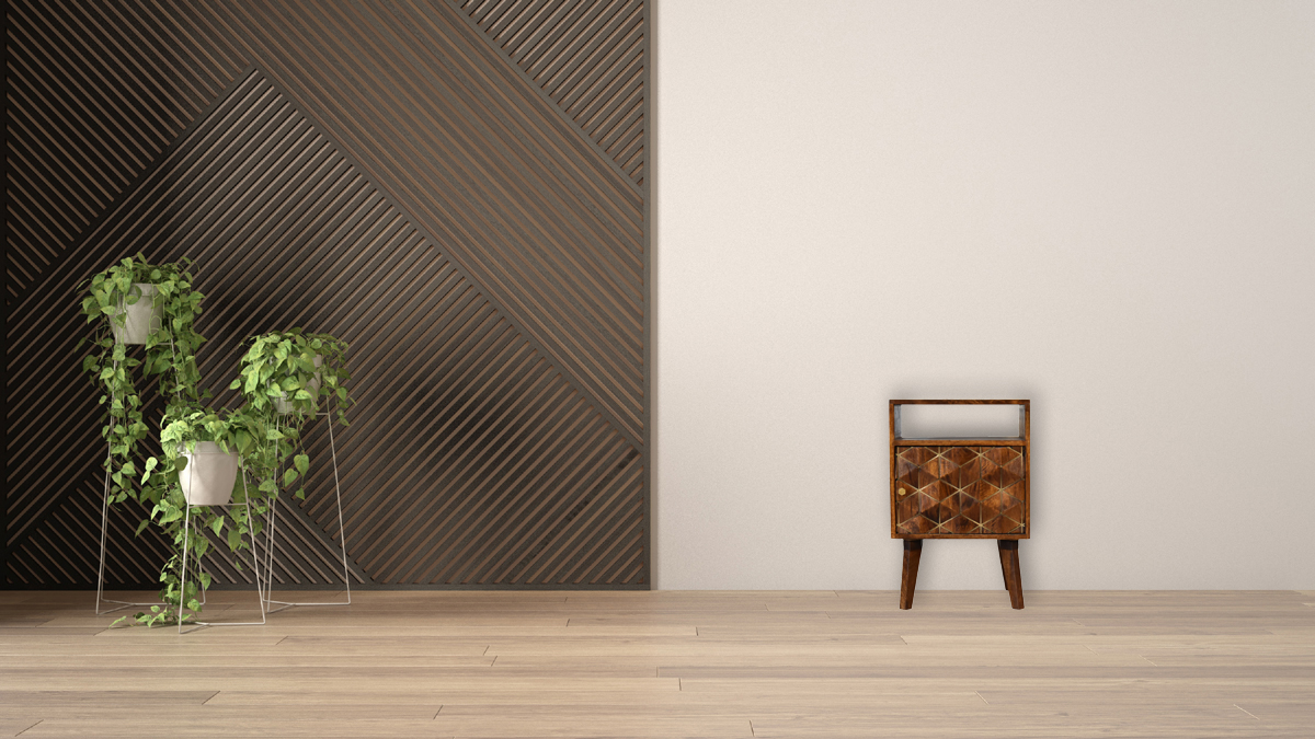 The Samara Bedside is thoughtfully constructed from 100% solid mango wood, known for its robustness and environmental sustainability. It sports a chestnut finish that radiates warmth and adds an inviting tone to your slumber sanctuary. Designed not only for its functionality, the Samara Bedside showcases a striking carved diamond brass inlay pattern on the door, immediately catching the eye and drawing attention to the meticulous detail and artistry that goes into every piece.