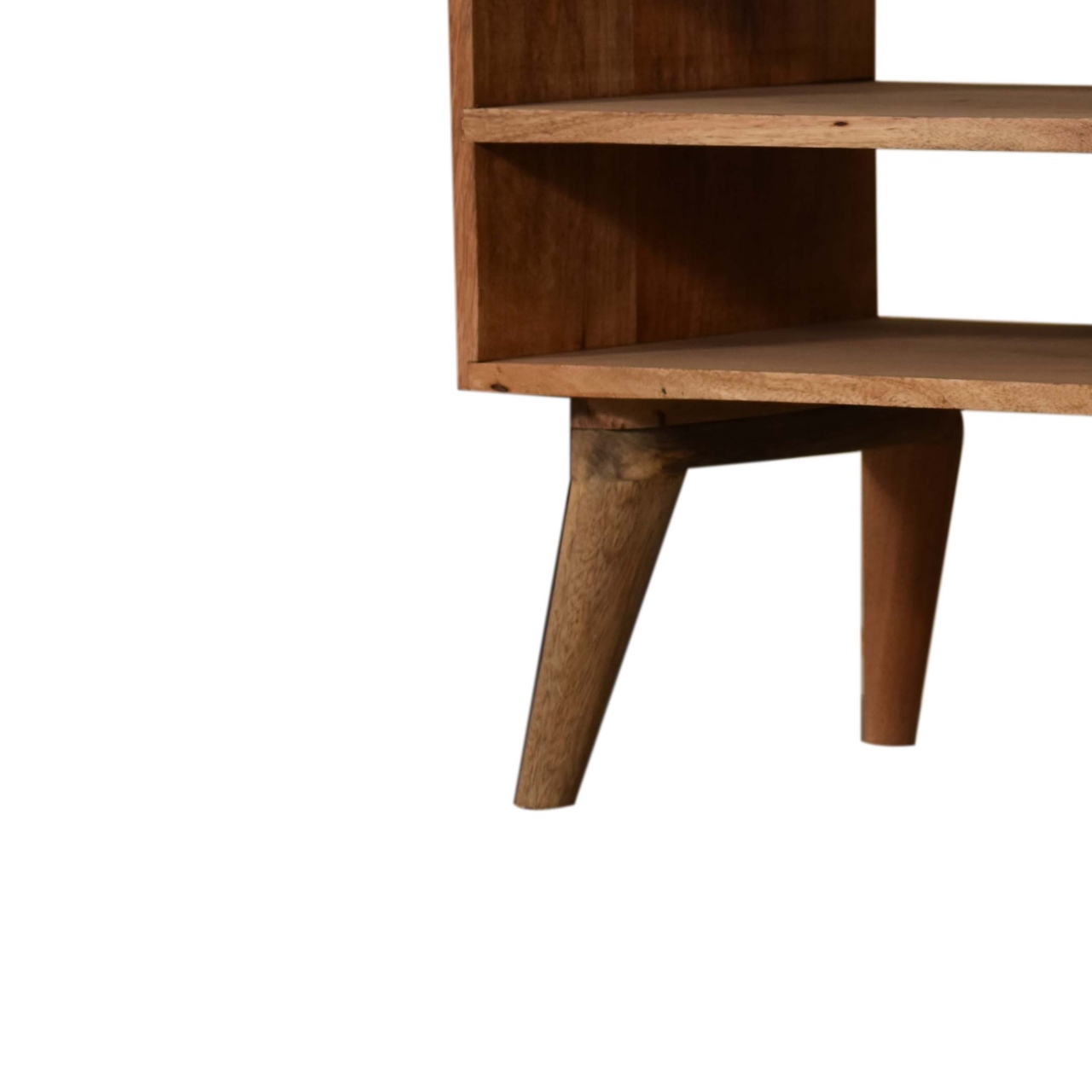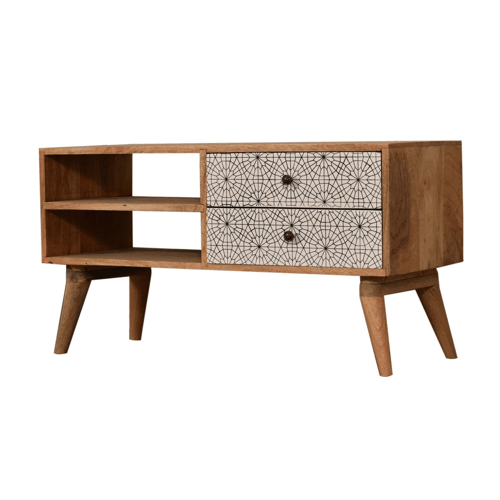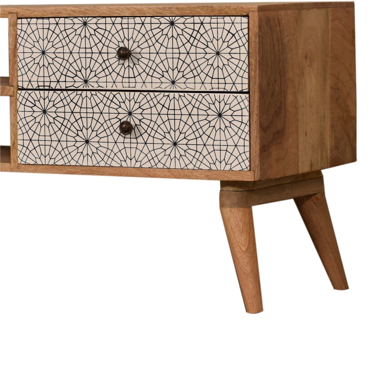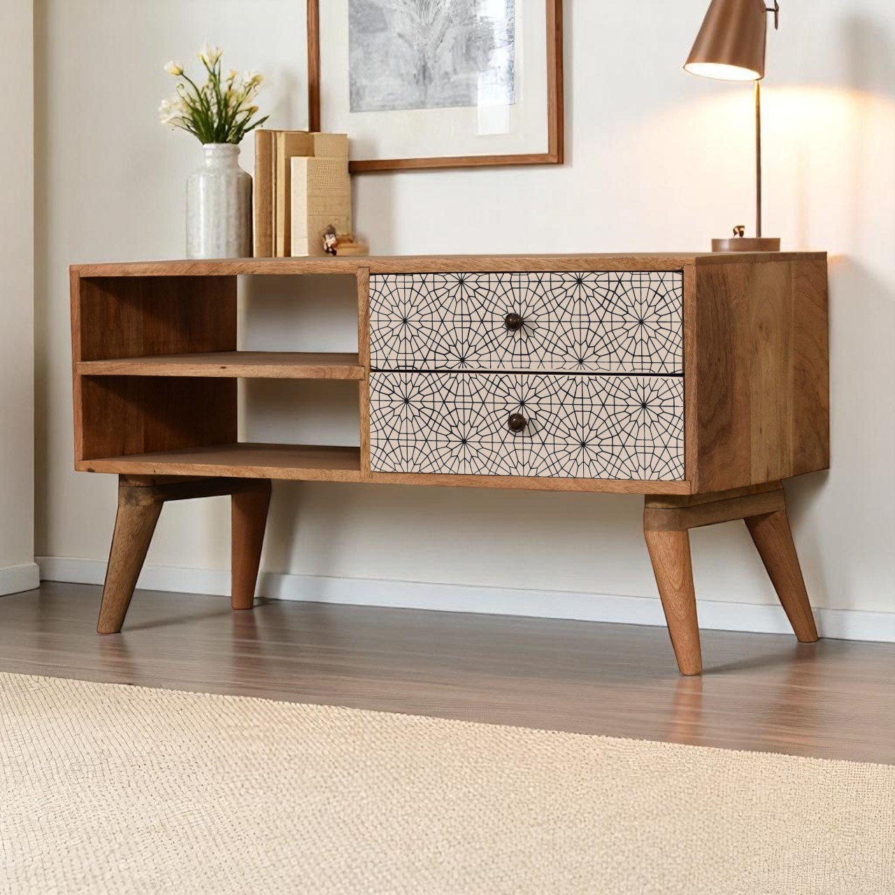 Painstakingly crafted from sustainably sourced, 100% solid mango wood, this media unit is a testament to the timeless beauty and durability of natural materials. Its finish radiates warmth and enhances the intricate, screen-printed designs on the drawer fronts, converting a functional item into a statement piece. Two spacious drawers beckon, ready to organize your collection of CDs, films, or books, while open slots accommodate your electronic devices, ensuring they are easily accessible yet neatly stowed.