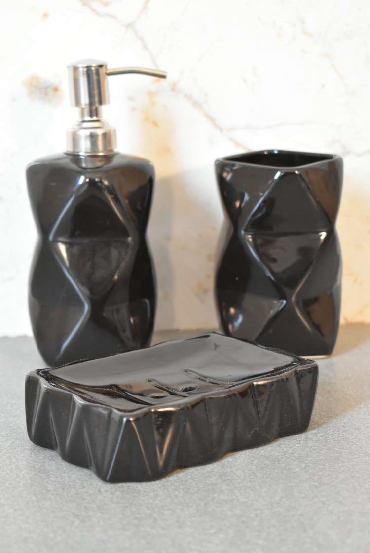 Transform your bathroom into an oasis of contemporary elegance with the Sindri Black Bathroom Set of 3. Designed to infuse your space with sophistication, this glossy 3-piece set, made from premium porcelain, promises to be both a practical addition and a stylish focal point in modern interior aesthetics. Comprising a soap dispenser, a soap dish, and a toothbrush holder, this set is tailored to meet all your daily needs with an impeccable blend of form and function.
