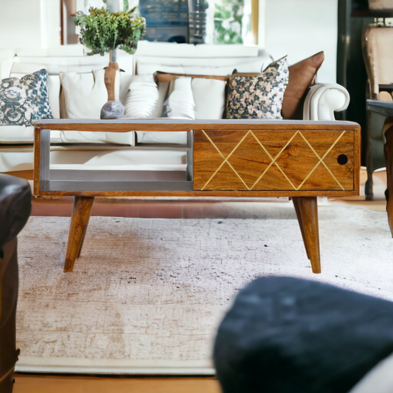 At the heart of the Sliding Brass Inlay Media Unit is the commitment to sustainability. Constructed from renewable mango wood, this enchanting piece not only stands the test of time but also assures an ecologically conscious furniture choice for your home. Its finish, applied with the utmost respect for the environment, ensures that your acquisition is a stand against deforestation and pollution, cementing your role as a protector of our precious planet.