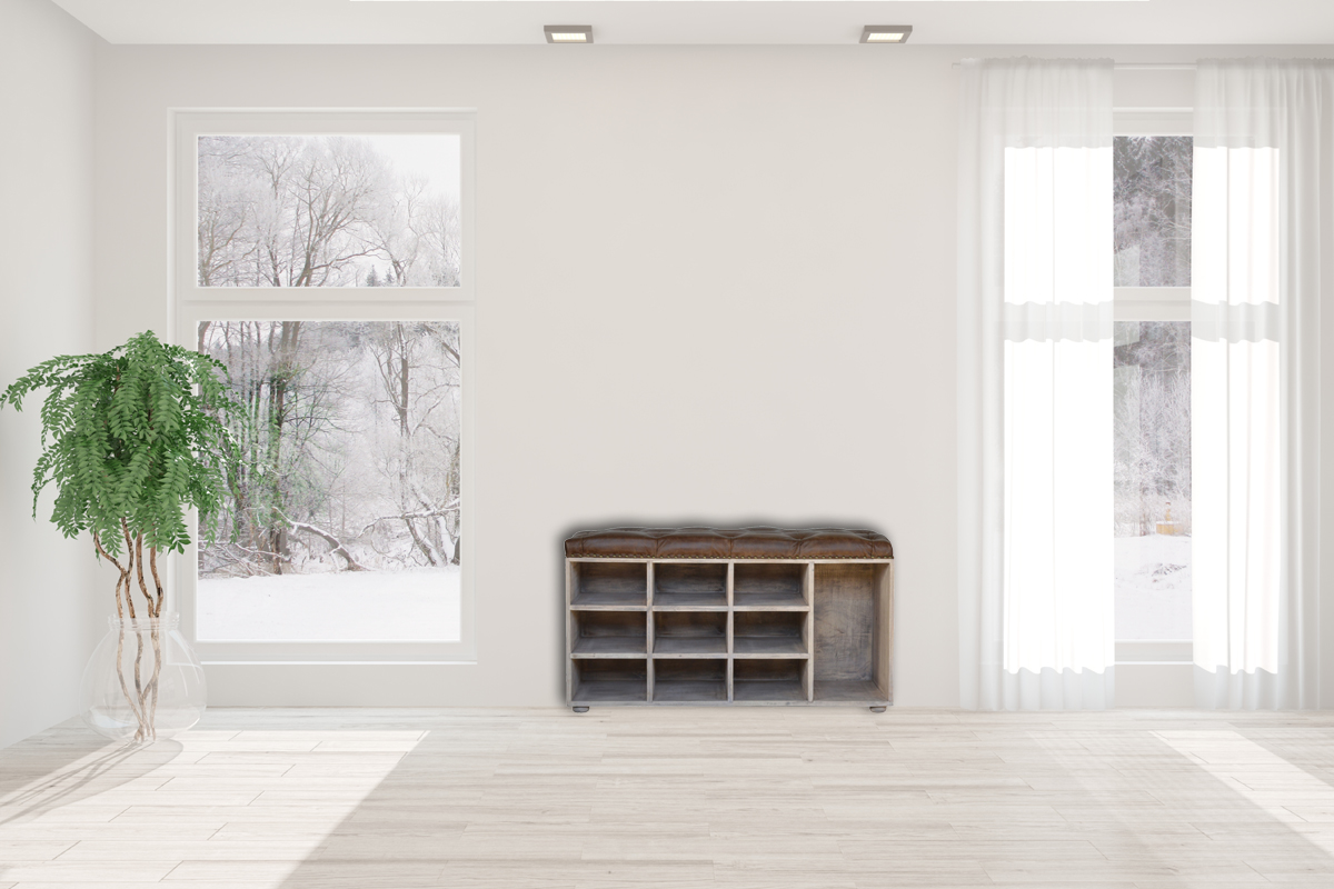 Keeping in step with the storage bench’s rustic charm is the seat – a generous expanse of supple buffalo leather, invitingly plump and irresistibly comfortable. It’s detailed with meticulous stud work, adding a tactile dimension, and a sense of craft that is both impressive and delightful. The bench’s top isn’t just about the look and feel; it provides a practical perch to sit and change shoes, a convenience that is sure to be appreciated daily.