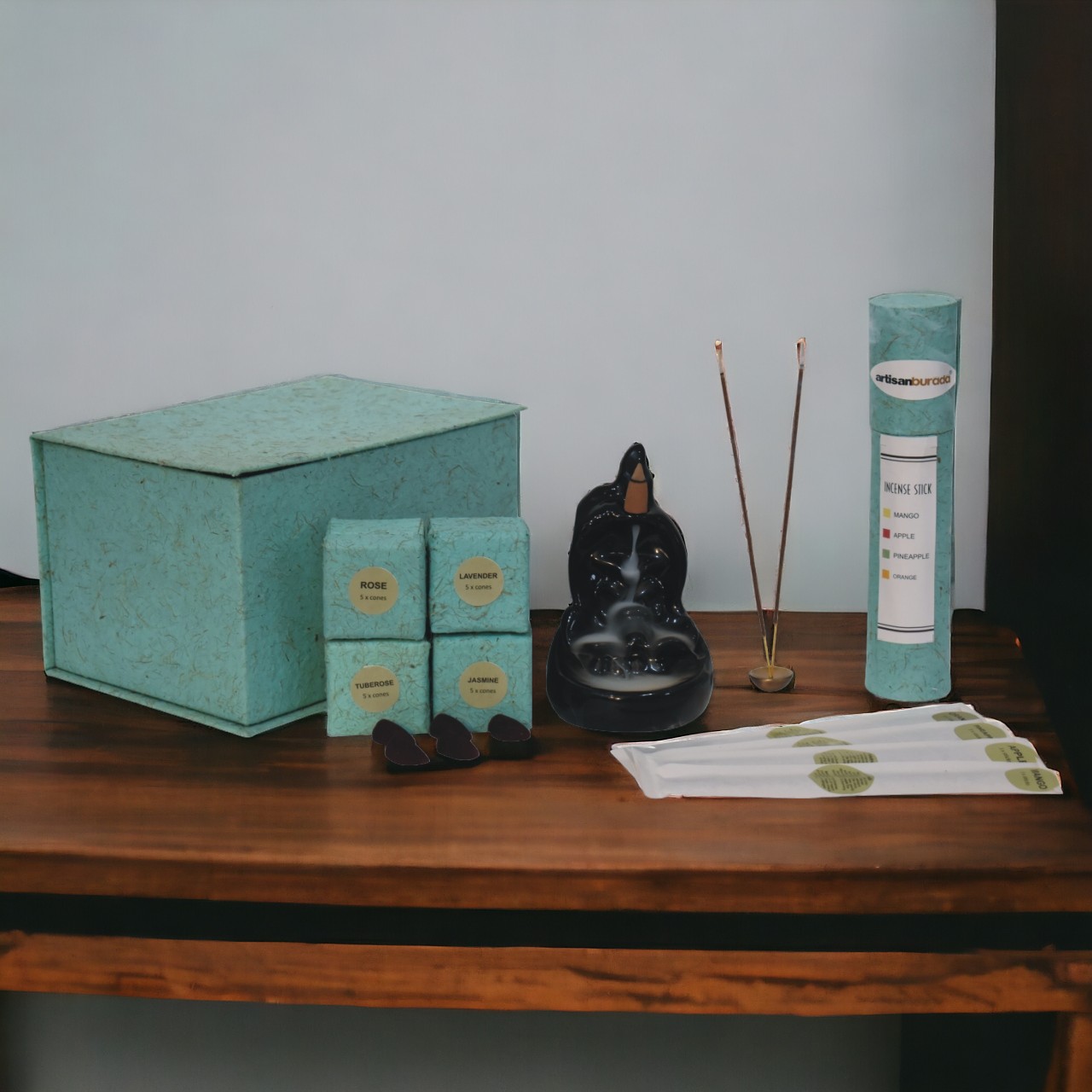 The backflow fountain burner set is exquisitely crafted and features a unique temple style design, ideal as a gift for friends and family. The set includes a backflow burner, incense holder,fragrant backflow cones in Rose, Lavender, Jasmine, Tuberose and fragrant inscense sticks in Mango, Apple, Pineapple and Orange.