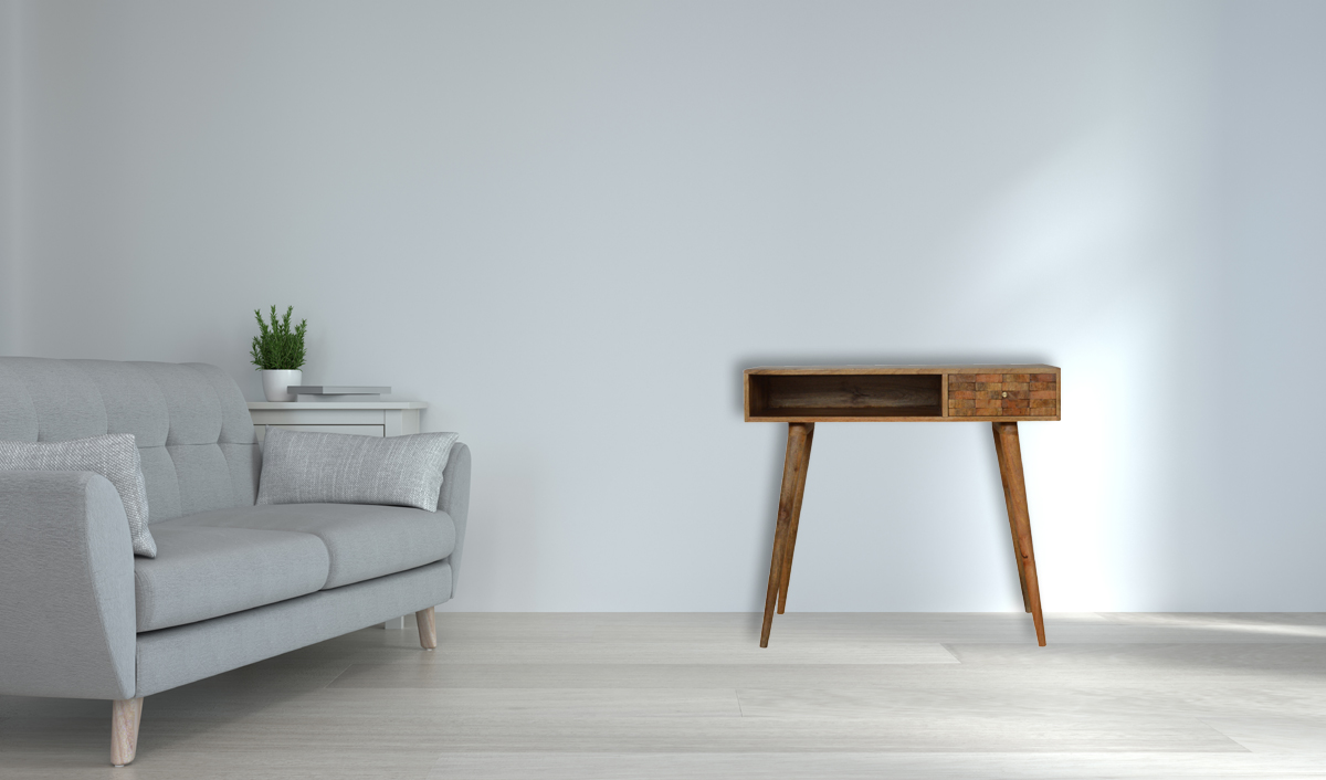 Sustain your environment and enhance your decor with the Tile Carved Open Slot Writing Desk. With each selection of this eco-friendly mango wood desk, you become an ally to the planet. The sustainable origins of the materials, coupled with environmentally considerate production processes, ensure that your choice is one that supports enduring practices. It’s not merely furniture; it’s a pledge to a greener future and a salute to the virtue of conscious living.