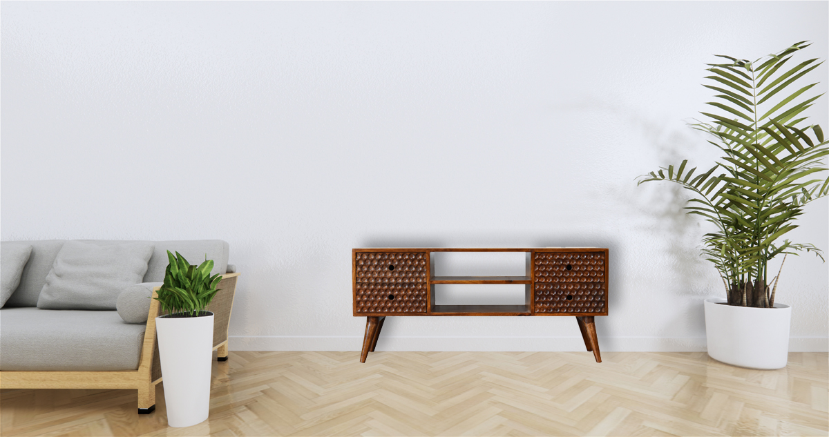 The Torun Media Unit is a reflection of our passion for handmade Indian furniture that offers unparalleled quality and individuality. Each unit tells the story of skilled artisans who, using traditional techniques and local materials, have created a piece that is as unique as it is functional. The attention to detail and craftsmanship arcs back to an era when furniture was not just made but was lovingly brought to life.