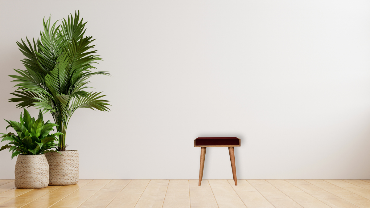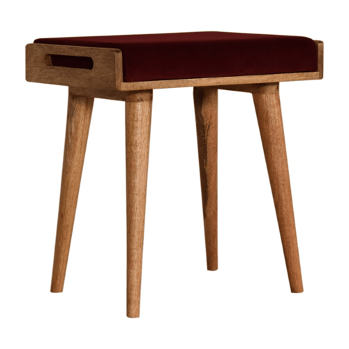 This footstool features a tray-style design and 4 Nordic-style legs constructed from 100% solid mango wood. It has been upholstered in a wine red cotton velvet that works as a comfortable seat and can be incorporated into many different interior styles as it offers a very clean and modern design, along with providing a nice contrast between the material and wood.