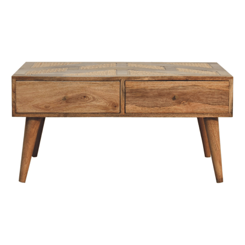 At the heart of this product is the high-quality construction using 100% solid mango wood, bearing the enchanting oak-ish finish that imparts a serene and natural vibe. The table’s surface is a canvas showcasing an intricate Aztec-inspired rattan design—a delightful nod to ethnic motifs that bring an exclusive character to your interiors. The wood’s natural texture harmoniously complements the woven pattern, juxtaposing the organic feel with the precision of craftsmanship.