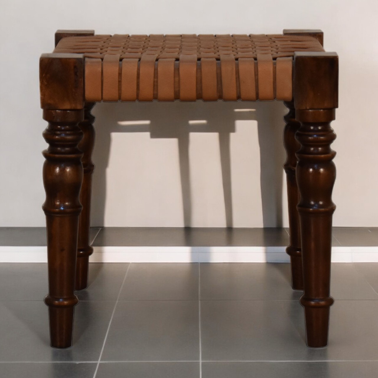 The seat of the footstool is meticulously crafted with a woven leather style, offering a soft yet sturdy surface for resting your feet. This woven design not only provides a beautiful contrast against the wooden frame but also ensures comfort, making it an inviting piece for any space. The supple leather strips are interlaced with precision, highlighting the footstool’s artisanal quality and adding a unique texture to your room.